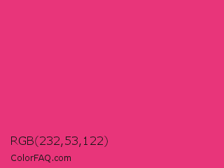 RGB 232,53,122 Color is a normal rose color and the nearest color is Cerise Pink #ec3b83. Hex code #e8357a and RGB value is rgb(232,53,122). In RGB color space, this color is composed of 91% red, 21% green, 48% blue, In CMYK color space, this color is composed of 0% cyan, 77% magenta, 47% yellow , 9% black , In HSL color space, this color has a hue angle of 337° , 80% saturation and 56% lightness.