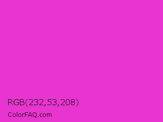RGB 232,53,208 Color is a normal magenta color and the nearest color is Razzle Dazzle Rose #ff33cc. Hex code #e835d0 and RGB value is rgb(232,53,208). In RGB color space, this color is composed of 91% red, 21% green, 82% blue, In CMYK color space, this color is composed of 0% cyan, 77% magenta, 10% yellow , 9% black , In HSL color space, this color has a hue angle of 308° , 80% saturation and 56% lightness.