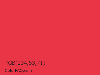 RGB 234,53,71 Color is a normal red color and the nearest color is Desire #ea3c53. Hex code #ea3547 and RGB value is rgb(234,53,71). In RGB color space, this color is composed of 92% red, 21% green, 28% blue, In CMYK color space, this color is composed of 0% cyan, 77% magenta, 70% yellow , 8% black , In HSL color space, this color has a hue angle of 354° , 81% saturation and 56% lightness.