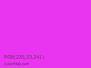 RGB 235,53,241 Color is a normal magenta color and the nearest color is Purple Pizzazz #fe4eda. Hex code #eb35f1 and RGB value is rgb(235,53,241). In RGB color space, this color is composed of 92% red, 21% green, 95% blue, In CMYK color space, this color is composed of 2% cyan, 78% magenta, 0% yellow , 5% black , In HSL color space, this color has a hue angle of 298° , 87% saturation and 58% lightness.
