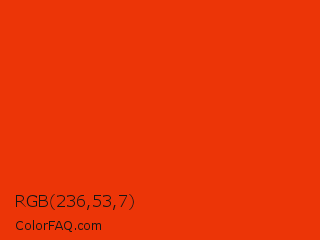 RGB 236,53,7 Color is a normal red color and the nearest color is Coquelicot #ff3800. Hex code #ec3507 and RGB value is rgb(236,53,7). In RGB color space, this color is composed of 93% red, 21% green, 3% blue, In CMYK color space, this color is composed of 0% cyan, 78% magenta, 97% yellow , 7% black , In HSL color space, this color has a hue angle of 12° , 94% saturation and 48% lightness.