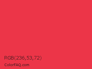 RGB 236,53,72 Color is a normal red color and the nearest color is Desire #ea3c53. Hex code #ec3548 and RGB value is rgb(236,53,72). In RGB color space, this color is composed of 93% red, 21% green, 28% blue, In CMYK color space, this color is composed of 0% cyan, 78% magenta, 69% yellow , 7% black , In HSL color space, this color has a hue angle of 354° , 83% saturation and 57% lightness.