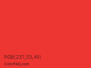 RGB 237,53,49 Color is a normal red color and the nearest color is Deep Carmine Pink #ef3038. Hex code #ed3531 and RGB value is rgb(237,53,49). In RGB color space, this color is composed of 93% red, 21% green, 19% blue, In CMYK color space, this color is composed of 0% cyan, 78% magenta, 79% yellow , 7% black , In HSL color space, this color has a hue angle of 1° , 84% saturation and 56% lightness.