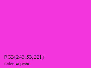 RGB 243,53,221 Color is a normal magenta color and the nearest color is Razzle Dazzle Rose #ff33cc. Hex code #f335dd and RGB value is rgb(243,53,221). In RGB color space, this color is composed of 95% red, 21% green, 87% blue, In CMYK color space, this color is composed of 0% cyan, 78% magenta, 9% yellow , 5% black , In HSL color space, this color has a hue angle of 307° , 89% saturation and 58% lightness.