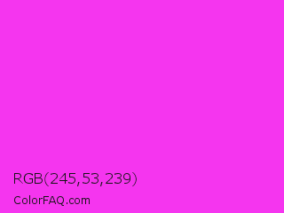 RGB 245,53,239 Color is a normal magenta color and the nearest color is Purple Pizzazz #fe4eda. Hex code #f535ef and RGB value is rgb(245,53,239). In RGB color space, this color is composed of 96% red, 21% green, 94% blue, In CMYK color space, this color is composed of 0% cyan, 78% magenta, 2% yellow , 4% black , In HSL color space, this color has a hue angle of 302° , 91% saturation and 58% lightness.
