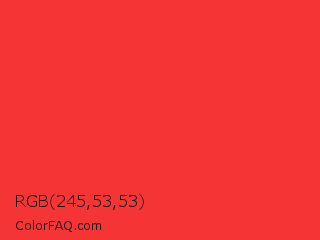RGB 245,53,53 Color is a normal red color and the nearest color is Deep Carmine Pink #ef3038. Hex code #f53535 and RGB value is rgb(245,53,53). In RGB color space, this color is composed of 96% red, 21% green, 21% blue, In CMYK color space, this color is composed of 0% cyan, 78% magenta, 78% yellow , 4% black , In HSL color space, this color has a hue angle of 0° , 91% saturation and 58% lightness.