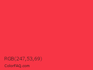 RGB 247,53,69 Color is a normal red color and the nearest color is Red Salsa #fd3a4a. Hex code #f73545 and RGB value is rgb(247,53,69). In RGB color space, this color is composed of 97% red, 21% green, 27% blue, In CMYK color space, this color is composed of 0% cyan, 79% magenta, 72% yellow , 3% black , In HSL color space, this color has a hue angle of 355° , 92% saturation and 59% lightness.