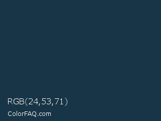 RGB 24,53,71 Color is a very dark blue color and the nearest color is Elephant #123447. Hex code #183547 and RGB value is rgb(24,53,71). In RGB color space, this color is composed of 9% red, 21% green, 28% blue, In CMYK color space, this color is composed of 66% cyan, 25% magenta, 0% yellow , 72% black , In HSL color space, this color has a hue angle of 203° , 49% saturation and 19% lightness.