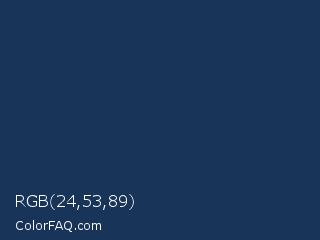 RGB 24,53,89 Color is a very dark blue color and the nearest color is Cello #1e385b. Hex code #183559 and RGB value is rgb(24,53,89). In RGB color space, this color is composed of 9% red, 21% green, 35% blue, In CMYK color space, this color is composed of 73% cyan, 40% magenta, 0% yellow , 65% black , In HSL color space, this color has a hue angle of 213° , 58% saturation and 22% lightness.