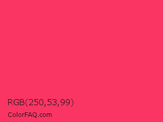 RGB 250,53,99 Color is a normal red color and the nearest color is Radical Red #ff355e. Hex code #fa3563 and RGB value is rgb(250,53,99). In RGB color space, this color is composed of 98% red, 21% green, 39% blue, In CMYK color space, this color is composed of 0% cyan, 79% magenta, 60% yellow , 2% black , In HSL color space, this color has a hue angle of 346° , 95% saturation and 59% lightness.