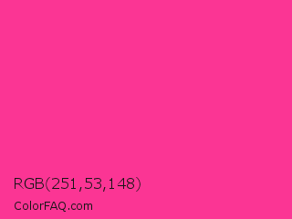 RGB 251,53,148 Color is a normal rose color and the nearest color is Wild Strawberry Crayola #ff3399. Hex code #fb3594 and RGB value is rgb(251,53,148). In RGB color space, this color is composed of 98% red, 21% green, 58% blue, In CMYK color space, this color is composed of 0% cyan, 79% magenta, 41% yellow , 2% black , In HSL color space, this color has a hue angle of 331° , 96% saturation and 60% lightness.
