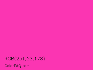 RGB 251,53,178 Color is a normal magenta color and the nearest color is Wild Strawberry #ff43a4. Hex code #fb35b2 and RGB value is rgb(251,53,178). In RGB color space, this color is composed of 98% red, 21% green, 70% blue, In CMYK color space, this color is composed of 0% cyan, 79% magenta, 29% yellow , 2% black , In HSL color space, this color has a hue angle of 322° , 96% saturation and 60% lightness.