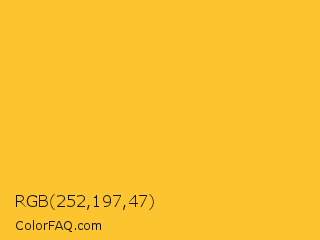RGB 252,197,47 Color is a normal orange color and the nearest color is Saffron #f4c430. Hex code #fcc52f and RGB value is rgb(252,197,47). In RGB color space, this color is composed of 99% red, 77% green, 18% blue, In CMYK color space, this color is composed of 0% cyan, 22% magenta, 81% yellow , 1% black , In HSL color space, this color has a hue angle of 44° , 97% saturation and 59% lightness.