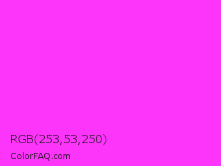 RGB 253,53,250 Color is a normal magenta color and the nearest color is Purple Pizzazz #fe4eda. Hex code #fd35fa and RGB value is rgb(253,53,250). In RGB color space, this color is composed of 99% red, 21% green, 98% blue, In CMYK color space, this color is composed of 0% cyan, 79% magenta, 1% yellow , 1% black , In HSL color space, this color has a hue angle of 301° , 98% saturation and 60% lightness.