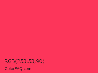 RGB 253,53,90 Color is a normal red color and the nearest color is Radical Red #ff355e. Hex code #fd355a and RGB value is rgb(253,53,90). In RGB color space, this color is composed of 99% red, 21% green, 35% blue, In CMYK color space, this color is composed of 0% cyan, 79% magenta, 64% yellow , 1% black , In HSL color space, this color has a hue angle of 349° , 98% saturation and 60% lightness.