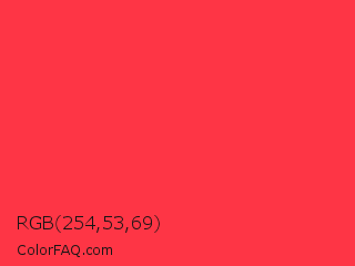 RGB 254,53,69 Color is a normal red color and the nearest color is Red Salsa #fd3a4a. Hex code #fe3545 and RGB value is rgb(254,53,69). In RGB color space, this color is composed of 100% red, 21% green, 27% blue, In CMYK color space, this color is composed of 0% cyan, 79% magenta, 73% yellow , 0% black , In HSL color space, this color has a hue angle of 355° , 99% saturation and 60% lightness.