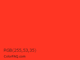 RGB 255,53,35 Color is a normal red color and the nearest color is Red Orange #ff3f34. Hex code #ff3523 and RGB value is rgb(255,53,35). In RGB color space, this color is composed of 100% red, 21% green, 14% blue, In CMYK color space, this color is composed of 0% cyan, 79% magenta, 86% yellow , 0% black , In HSL color space, this color has a hue angle of 5° , 100% saturation and 57% lightness.