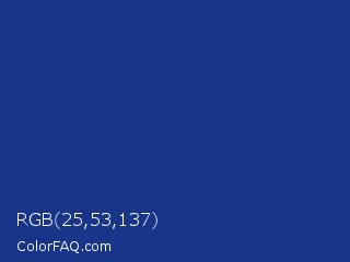 RGB 25,53,137 Color is a normal blue color and the nearest color is Bay Of Many #273a81. Hex code #193589 and RGB value is rgb(25,53,137). In RGB color space, this color is composed of 10% red, 21% green, 54% blue, In CMYK color space, this color is composed of 82% cyan, 61% magenta, 0% yellow , 46% black , In HSL color space, this color has a hue angle of 225° , 69% saturation and 32% lightness.