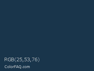 RGB 25,53,76 Color is a very dark blue color and the nearest color is Nile Blue #193751. Hex code #19354c and RGB value is rgb(25,53,76). In RGB color space, this color is composed of 10% red, 21% green, 30% blue, In CMYK color space, this color is composed of 67% cyan, 30% magenta, 0% yellow , 70% black , In HSL color space, this color has a hue angle of 207° , 50% saturation and 20% lightness.
