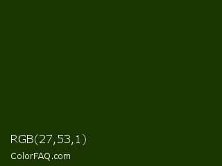 RGB 27,53,1 Color is a very dark green color and the nearest color is Deep Forest Green #182d09. Hex code #1b3501 and RGB value is rgb(27,53,1). In RGB color space, this color is composed of 11% red, 21% green, 0% blue, In CMYK color space, this color is composed of 49% cyan, 0% magenta, 98% yellow , 79% black , In HSL color space, this color has a hue angle of 90° , 96% saturation and 11% lightness.