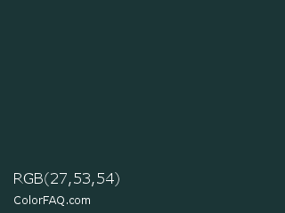 RGB 27,53,54 Color is a very dark cyan color and the nearest color is Gable Green #163531. Hex code #1b3536 and RGB value is rgb(27,53,54). In RGB color space, this color is composed of 11% red, 21% green, 21% blue, In CMYK color space, this color is composed of 50% cyan, 2% magenta, 0% yellow , 79% black , In HSL color space, this color has a hue angle of 182° , 33% saturation and 16% lightness.