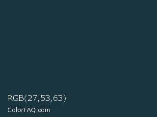 RGB 27,53,63 Color is a very dark blue color and the nearest color is Elephant #123447. Hex code #1b353f and RGB value is rgb(27,53,63). In RGB color space, this color is composed of 11% red, 21% green, 25% blue, In CMYK color space, this color is composed of 57% cyan, 16% magenta, 0% yellow , 75% black , In HSL color space, this color has a hue angle of 197° , 40% saturation and 18% lightness.