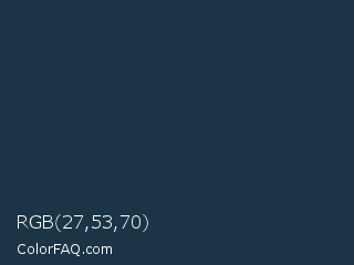 RGB 27,53,70 Color is a very dark blue color and the nearest color is Elephant #123447. Hex code #1b3546 and RGB value is rgb(27,53,70). In RGB color space, this color is composed of 11% red, 21% green, 27% blue, In CMYK color space, this color is composed of 61% cyan, 24% magenta, 0% yellow , 73% black , In HSL color space, this color has a hue angle of 204° , 44% saturation and 19% lightness.