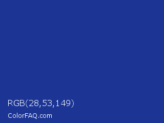 RGB 28,53,149 Color is a normal blue color and the nearest color is Torea Bay #0f2d9e. Hex code #1c3595 and RGB value is rgb(28,53,149). In RGB color space, this color is composed of 11% red, 21% green, 58% blue, In CMYK color space, this color is composed of 81% cyan, 64% magenta, 0% yellow , 42% black , In HSL color space, this color has a hue angle of 228° , 68% saturation and 35% lightness.