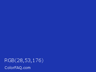 RGB 28,53,176 Color is a normal blue color and the nearest color is Persian Blue #1c39bb. Hex code #1c35b0 and RGB value is rgb(28,53,176). In RGB color space, this color is composed of 11% red, 21% green, 69% blue, In CMYK color space, this color is composed of 84% cyan, 70% magenta, 0% yellow , 31% black , In HSL color space, this color has a hue angle of 230° , 73% saturation and 40% lightness.