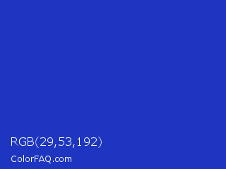 RGB 29,53,192 Color is a normal blue color and the nearest color is Persian Blue #1c39bb. Hex code #1d35c0 and RGB value is rgb(29,53,192). In RGB color space, this color is composed of 11% red, 21% green, 75% blue, In CMYK color space, this color is composed of 85% cyan, 72% magenta, 0% yellow , 25% black , In HSL color space, this color has a hue angle of 231° , 74% saturation and 43% lightness.