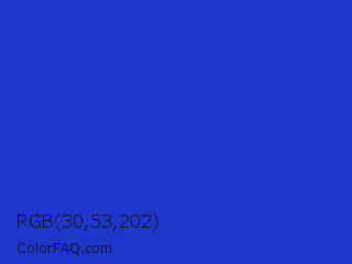 RGB 30,53,202 Color is a normal blue color and the nearest color is Persian Blue #1c39bb. Hex code #1e35ca and RGB value is rgb(30,53,202). In RGB color space, this color is composed of 12% red, 21% green, 79% blue, In CMYK color space, this color is composed of 85% cyan, 74% magenta, 0% yellow , 21% black , In HSL color space, this color has a hue angle of 232° , 74% saturation and 45% lightness.