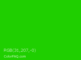 RGB 31,207,-0 Color is a normal green color and the nearest color is Harlequin Green #46cb18. Hex code #1fcf00 and RGB value is rgb(31,207,-0). In RGB color space, this color is composed of 12% red, 81% green, 0% blue, In CMYK color space, this color is composed of 85% cyan, 0% magenta, 100% yellow , 19% black , In HSL color space, this color has a hue angle of 111° , 100% saturation and 41% lightness.