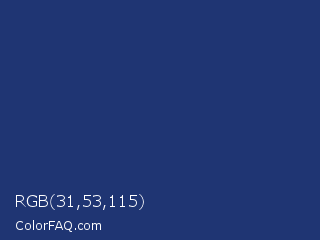RGB 31,53,115 Color is a dark blue color and the nearest color is Astronaut #283a77. Hex code #1f3573 and RGB value is rgb(31,53,115). In RGB color space, this color is composed of 12% red, 21% green, 45% blue, In CMYK color space, this color is composed of 73% cyan, 54% magenta, 0% yellow , 55% black , In HSL color space, this color has a hue angle of 224° , 58% saturation and 29% lightness.