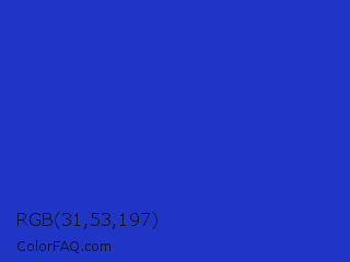 RGB 31,53,197 Color is a normal blue color and the nearest color is Persian Blue #1c39bb. Hex code #1f35c5 and RGB value is rgb(31,53,197). In RGB color space, this color is composed of 12% red, 21% green, 77% blue, In CMYK color space, this color is composed of 84% cyan, 73% magenta, 0% yellow , 23% black , In HSL color space, this color has a hue angle of 232° , 73% saturation and 45% lightness.