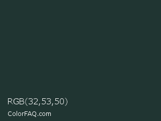 RGB 32,53,50 Color is a very dark cyan color and the nearest color is Medium Jungle Green #1c352d. Hex code #203532 and RGB value is rgb(32,53,50). In RGB color space, this color is composed of 13% red, 21% green, 20% blue, In CMYK color space, this color is composed of 40% cyan, 0% magenta, 6% yellow , 79% black , In HSL color space, this color has a hue angle of 171° , 25% saturation and 17% lightness.