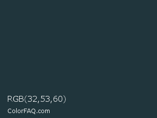 RGB 32,53,60 Color is a very dark blue color and the nearest color is Gunmetal #2a3439. Hex code #20353c and RGB value is rgb(32,53,60). In RGB color space, this color is composed of 13% red, 21% green, 24% blue, In CMYK color space, this color is composed of 47% cyan, 12% magenta, 0% yellow , 76% black , In HSL color space, this color has a hue angle of 195° , 30% saturation and 18% lightness.