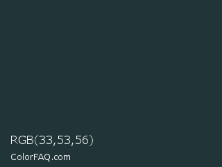 RGB 33,53,56 Color is a very dark cyan color and the nearest color is Gunmetal #2a3439. Hex code #213538 and RGB value is rgb(33,53,56). In RGB color space, this color is composed of 13% red, 21% green, 22% blue, In CMYK color space, this color is composed of 41% cyan, 5% magenta, 0% yellow , 78% black , In HSL color space, this color has a hue angle of 188° , 26% saturation and 17% lightness.
