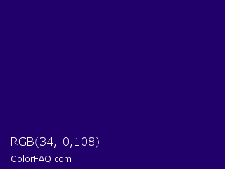 RGB 34,-0,108 Color is a very dark indigo color and the nearest color is Paua #260368. Hex code #22006c and RGB value is rgb(34,-0,108). In RGB color space, this color is composed of 13% red, 0% green, 42% blue, In CMYK color space, this color is composed of 69% cyan, 100% magenta, 0% yellow , 58% black , In HSL color space, this color has a hue angle of 259° , 100% saturation and 21% lightness.