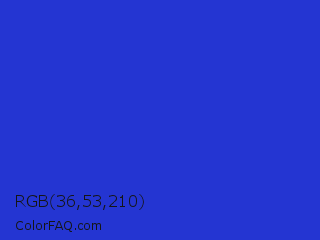 RGB 36,53,210 Color is a normal blue color and the nearest color is Palatinate Blue #273be2. Hex code #2435d2 and RGB value is rgb(36,53,210). In RGB color space, this color is composed of 14% red, 21% green, 82% blue, In CMYK color space, this color is composed of 83% cyan, 75% magenta, 0% yellow , 18% black , In HSL color space, this color has a hue angle of 234° , 71% saturation and 48% lightness.