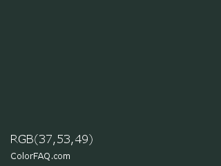 RGB 37,53,49 Color is a very dark cyan color and the nearest color is Black Leather Jacket #253529. Hex code #253531 and RGB value is rgb(37,53,49). In RGB color space, this color is composed of 15% red, 21% green, 19% blue, In CMYK color space, this color is composed of 30% cyan, 0% magenta, 8% yellow , 79% black , In HSL color space, this color has a hue angle of 165° , 18% saturation and 18% lightness.