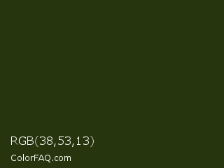 RGB 38,53,13 Color is a very dark green color and the nearest color is Turtle Green #2a380b. Hex code #26350d and RGB value is rgb(38,53,13). In RGB color space, this color is composed of 15% red, 21% green, 5% blue, In CMYK color space, this color is composed of 28% cyan, 0% magenta, 75% yellow , 79% black , In HSL color space, this color has a hue angle of 83° , 61% saturation and 13% lightness.