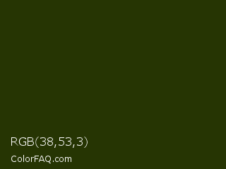 RGB 38,53,3 Color is a very dark lime color and the nearest color is Turtle Green #2a380b. Hex code #263503 and RGB value is rgb(38,53,3). In RGB color space, this color is composed of 15% red, 21% green, 1% blue, In CMYK color space, this color is composed of 28% cyan, 0% magenta, 94% yellow , 79% black , In HSL color space, this color has a hue angle of 78° , 89% saturation and 11% lightness.