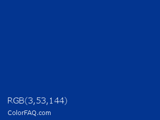 RGB 3,53,144 Color is a dark blue color and the nearest color is Air Force Blue USAF #00308f. Hex code #033590 and RGB value is rgb(3,53,144). In RGB color space, this color is composed of 1% red, 21% green, 56% blue, In CMYK color space, this color is composed of 98% cyan, 63% magenta, 0% yellow , 44% black , In HSL color space, this color has a hue angle of 219° , 96% saturation and 29% lightness.