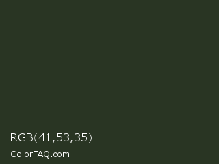 RGB 41,53,35 Color is a very dark green color and the nearest color is Rangitoto #2e3222. Hex code #293523 and RGB value is rgb(41,53,35). In RGB color space, this color is composed of 16% red, 21% green, 14% blue, In CMYK color space, this color is composed of 23% cyan, 0% magenta, 34% yellow , 79% black , In HSL color space, this color has a hue angle of 100° , 20% saturation and 17% lightness.