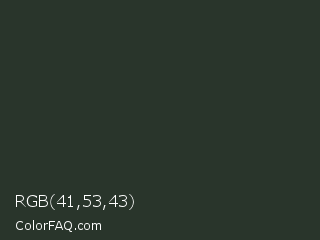 RGB 41,53,43 Color is a very dark green color and the nearest color is Black Leather Jacket #253529. Hex code #29352b and RGB value is rgb(41,53,43). In RGB color space, this color is composed of 16% red, 21% green, 17% blue, In CMYK color space, this color is composed of 23% cyan, 0% magenta, 19% yellow , 79% black , In HSL color space, this color has a hue angle of 130° , 13% saturation and 18% lightness.