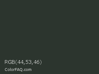 RGB 44,53,46 Color is a very dark green color and the nearest color is Heavy Metal #2b3228. Hex code #2c352e and RGB value is rgb(44,53,46). In RGB color space, this color is composed of 17% red, 21% green, 18% blue, In CMYK color space, this color is composed of 17% cyan, 0% magenta, 13% yellow , 79% black , In HSL color space, this color has a hue angle of 133° , 9% saturation and 19% lightness.