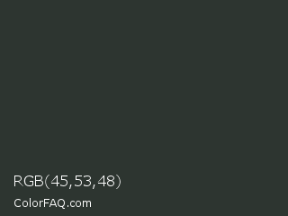 RGB 45,53,48 Color is a very dark green color and the nearest color is Mine Shaft #323232. Hex code #2d3530 and RGB value is rgb(45,53,48). In RGB color space, this color is composed of 18% red, 21% green, 19% blue, In CMYK color space, this color is composed of 15% cyan, 0% magenta, 9% yellow , 79% black , In HSL color space, this color has a hue angle of 143° , 8% saturation and 19% lightness.