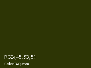 RGB 45,53,5 Color is a very dark yellow color and the nearest color is Turtle Green #2a380b. Hex code #2d3505 and RGB value is rgb(45,53,5). In RGB color space, this color is composed of 18% red, 21% green, 2% blue, In CMYK color space, this color is composed of 15% cyan, 0% magenta, 91% yellow , 79% black , In HSL color space, this color has a hue angle of 70° , 83% saturation and 11% lightness.