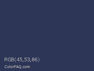RGB 45,53,86 Color is a dark blue color and the nearest color is Martinique #363050. Hex code #2d3556 and RGB value is rgb(45,53,86). In RGB color space, this color is composed of 18% red, 21% green, 34% blue, In CMYK color space, this color is composed of 48% cyan, 38% magenta, 0% yellow , 66% black , In HSL color space, this color has a hue angle of 228° , 31% saturation and 26% lightness.