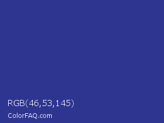 RGB 46,53,145 Color is a normal blue color and the nearest color is Blue Pigment #333399. Hex code #2e3591 and RGB value is rgb(46,53,145). In RGB color space, this color is composed of 18% red, 21% green, 57% blue, In CMYK color space, this color is composed of 68% cyan, 63% magenta, 0% yellow , 43% black , In HSL color space, this color has a hue angle of 236° , 52% saturation and 37% lightness.